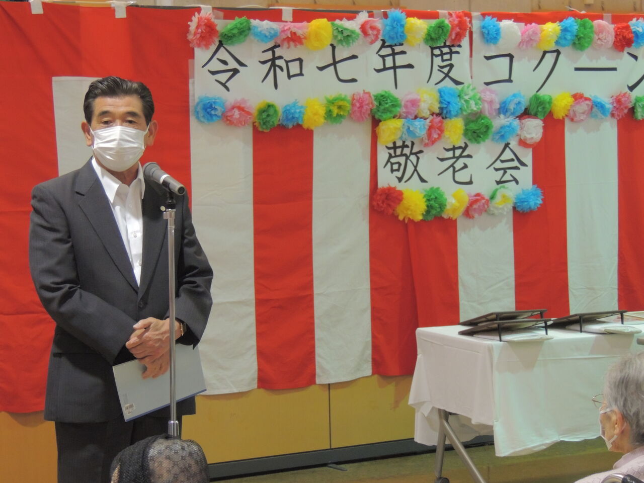 昨年の敬老会はコロナの影響もあり各ユニットでの開催でしたが、今年は一堂に会して正面玄関ホールでの開催となりました