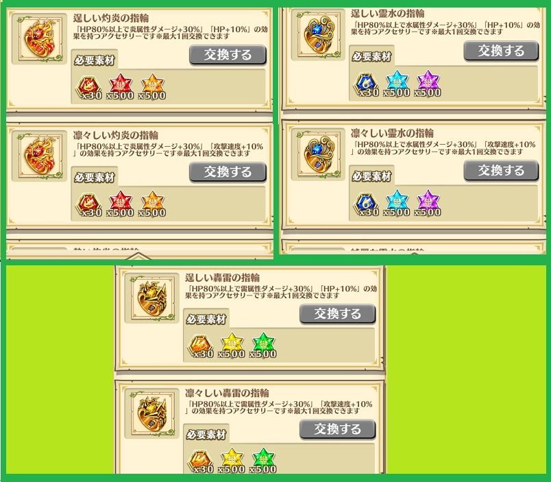 各エレメントから交換出来る指輪を収集するには、各スタールーン1500個ずつ必要。