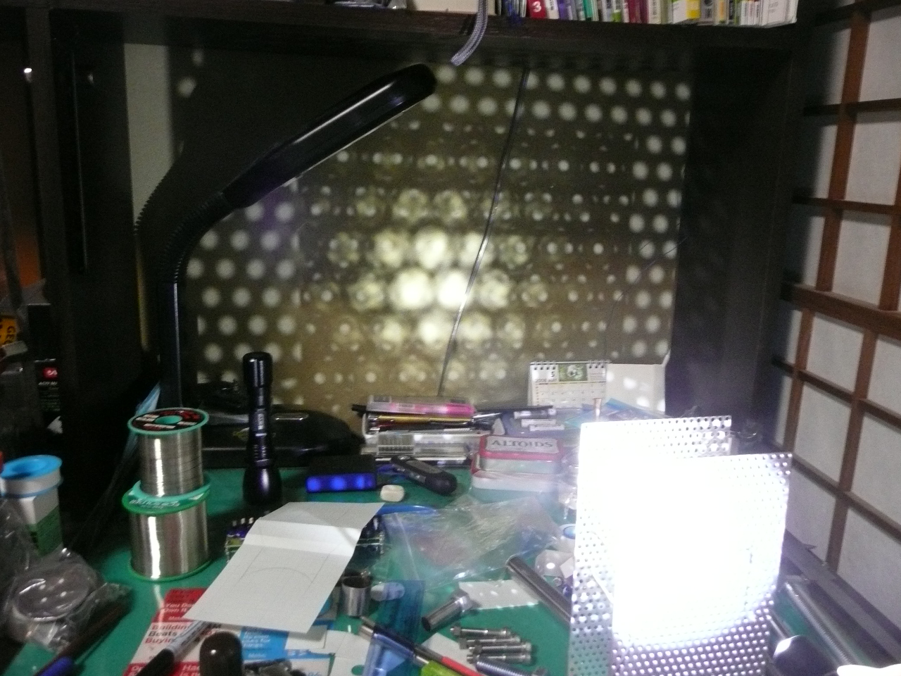 アルミのパンチングメタルを二枚重ね、そこにライトを当てると