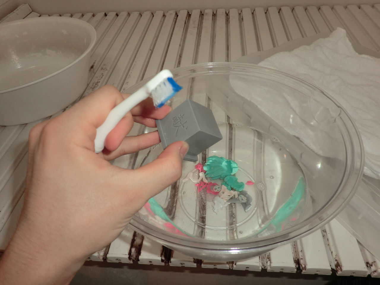 成形時に付いた離型剤やらバリ取りで出た粉やらを綺麗に落としておくことで塗装時に不便を無くすため