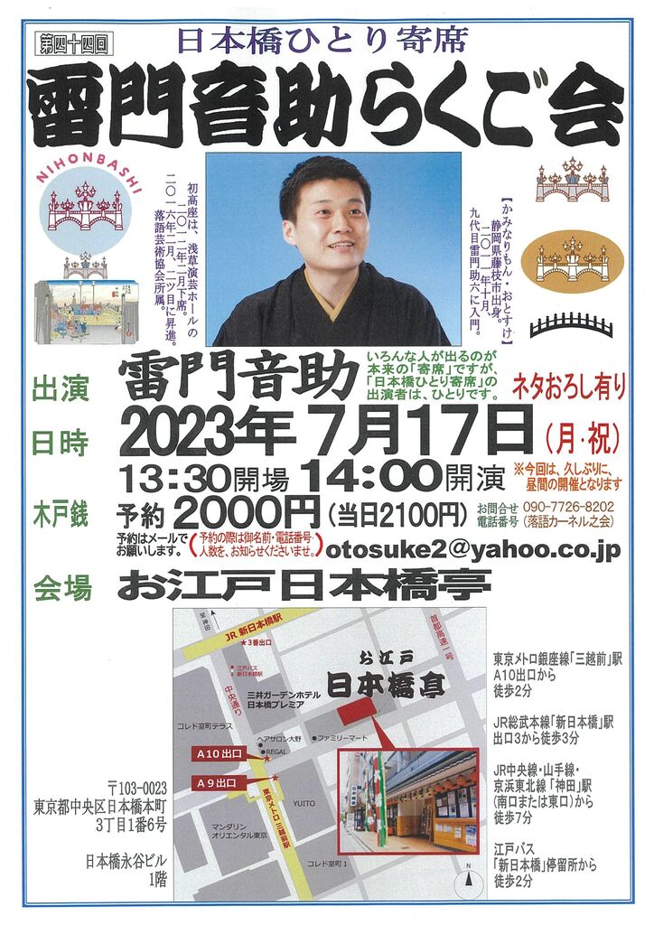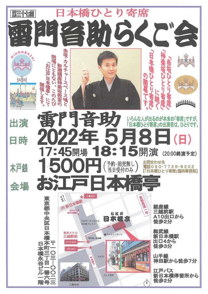そこで、第三十七回(2022年5月)からは、お江戸日本橋亭を会場に、「日本橋ひとり寄席 雷門音助らくご会」として、開催しています。