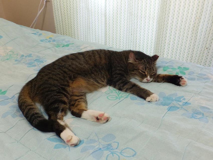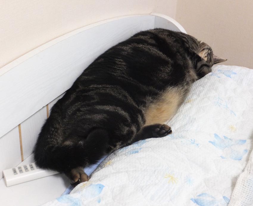 真央ちゃん、ダルくんがケージの中にいるので、今日は私のベッドの上ですやすや〜