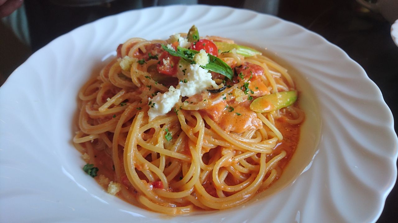 パスタランチは二種類から選びます。画像は「ベーコンとアスパラのトマトクリームパスタ」。彩りも好く、パスタの茹で具合はややアルデンテで量も多めです。