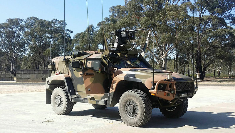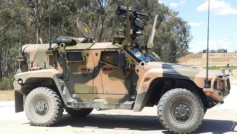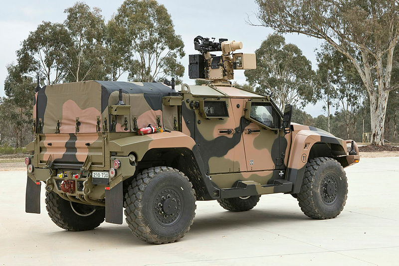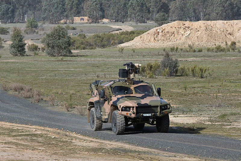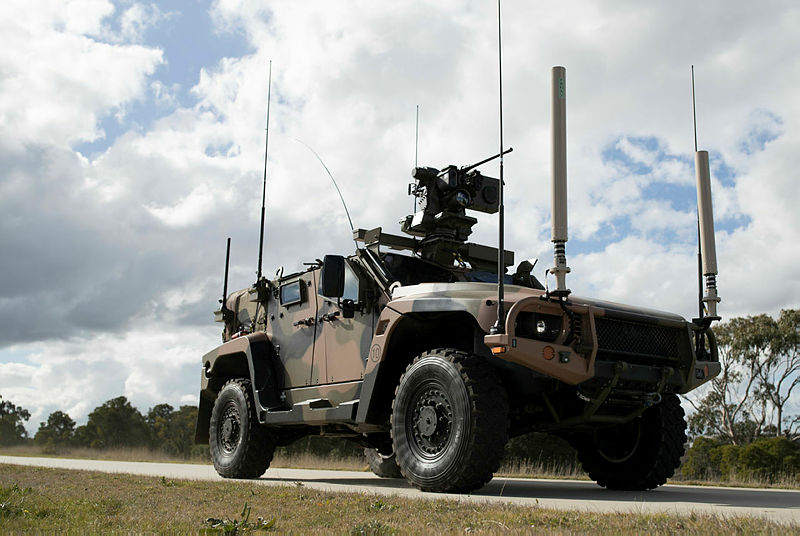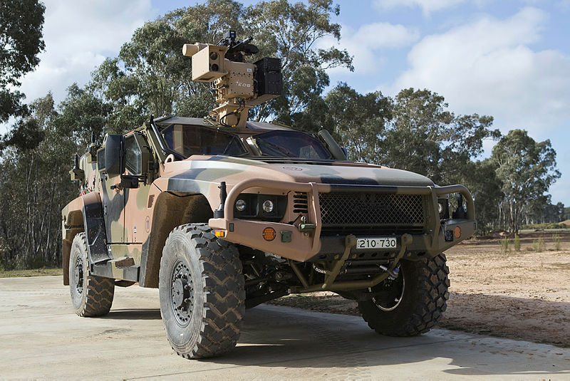 オーストラリア防衛省の実証施設「グレイタウン」で実験中の、Electro Optic Systems RS400 Mk2遠隔武器システムを装備した陸軍の「Hawkei」軽装甲車。