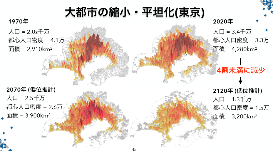 ただ、都市の人口が将来的にどのように推移していくのかを冷静に判断する必要がある。当ブログでも取り上げた京都大学経済研究所の森知也教授が、日本記者クラブで4月23日に講演を行い、最新の研究データを公開した。東京圏の50年後、100年後の人口推計を分かりやすく示した図が冒頭に示した図である。人口が密集した中心部の濃い色が薄くなり、都市の縮小・平坦化が進むと予測している。
