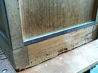 大事な黒柿の部分は なんとか残したいので、今回初めて 『木固め剤』 を使ってみました。 足の部分はどーにもこーにも 使える状態ではないので、
