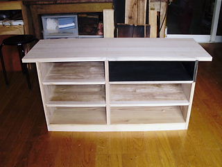 右上のスペースは デッキを入れたいということなので、塗装だけをして 裏板にコードを出すための穴をあけました。なんとか仕上げの鉋