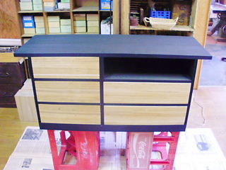 「板が薄いから難しいですね〜」 と言ってはみましたがどうしても何とかしたいらしいので、天板を新しく (厚い板に)交換して、重みのかかる中心部にツカを入れて、サイドの薄い板も補強して・・組み立て直しました。