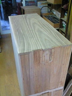 問題の虫食いは引き出し表面に薄く貼られた柾板 (目の真っ直ぐな板) に集中していたので、その部分は全て削って 新しい板を貼りました。