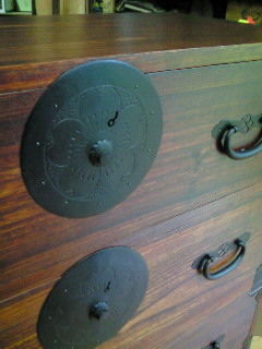 鉄金具の付いた時代箪笥風にしたいという お客様の希望があったので、他の古箪笥から外した鉄金具を加工(錆落し→再塗装) して付けました。