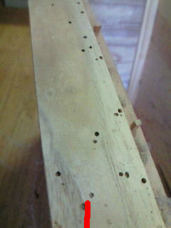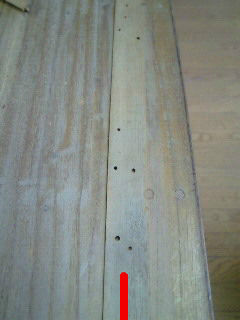 あの穴からムシが入ったのではなく、最初から材料に入っているらしく(?) ベテランの職人さんが言うには、ムシは外気に触れると死んでしまうから、木を食い破って外だとわかると『ヤベッ』とまた引き返すのだそうです(ホント〜?)