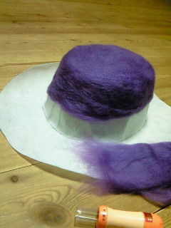 毛糸の帽子を編んだことはあるけれど、今回は初めての羊毛フエルトを使っての製作に挑戦です。洋裁用の芯を自分の頭に合わせて立体裁断、ハット型を作りそれを土台に羊毛を刺していくことにしました。