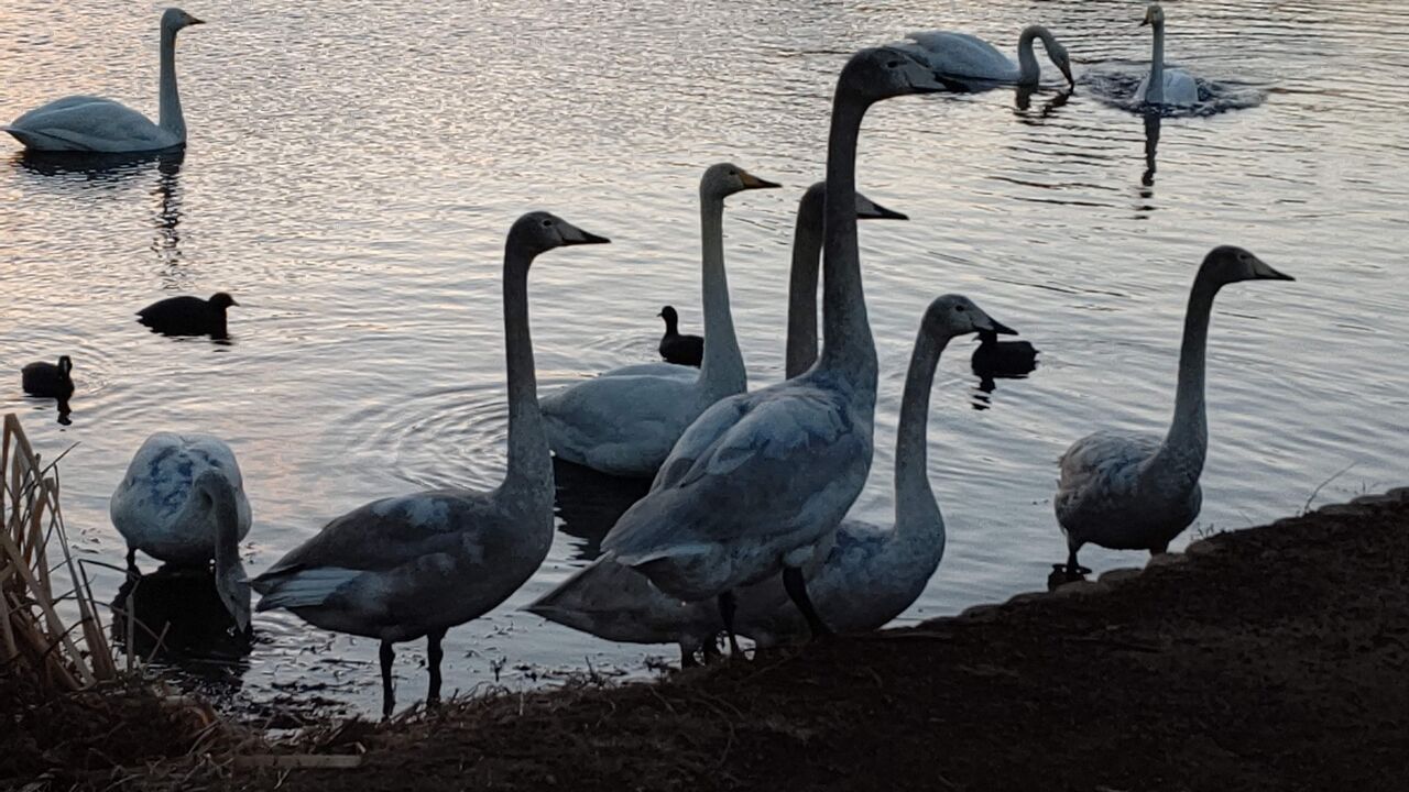 大島公園 オオハクチョウのはづくろい 2021年02月03日 カテゴリ:大島公園白鳥 mixiチェック 2021/01/31大島公園にて食事がひと段落すると、あちこちではづくろいが始まりました。最近飛来した8羽の大家族(夫婦2羽、子供6羽)も見つかりました。今日の食事に少しは満足してくれたようです。片親が写真に写りませんでした。アップでとりました、私に気が付いた親鳥がしっかりと監視しています。子供たちは安心してはづくろいを続けています。親鳥の凛(りん)とした顔つきが素晴らしいです。家族を守るためには、いつもきをゆるめません。さすが白鳥の父さん!少し寂しい気がしますが、これが必要なのですね。 タグ :#大島公園#オオハクチョウ#はづくろい#羽繕い