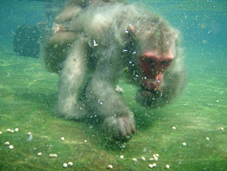 再びサルの水中の姿です。風呂の底に沈んだ餌を拾っているのが分かると思います。当然、水中でも目を開けているのです。