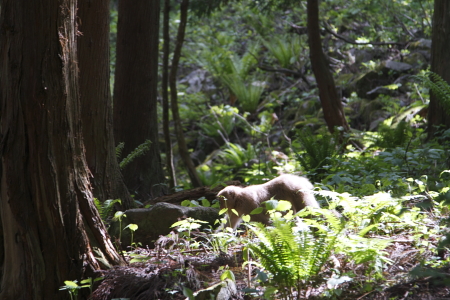 新緑の森ひんやりとした空気が溜まっている。青葉の間を抜けて朝日が森の底に差し込み、耳鳴りの様にエゾハルゼミの声が辺りを包む。足音もなく、オスザルが光の中を駆け抜ける。朝の森の光景は神々しいほどに美しい。