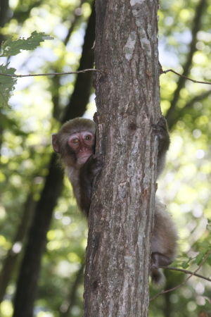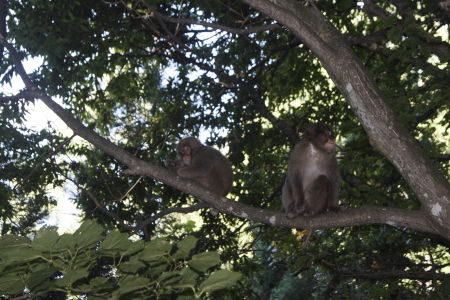 サルたちをけしかけて、さあ公苑へ、、、と、どこかで「キャッ」と警戒の声が上がると、慌ただしくサルたちが一斉に木にかけ上がり、きょろきょろと辺りを警戒している。さてはクマが近くにいるな。
