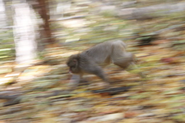 サルたちの声を聞きつけて、私が行くまでは食べ物を探したり、のんびり日なたでグルーミングしたり、交尾をしたりと三々五々過ごしていたようだ。藪をわけて現れた私の姿を見つけると「あ〜ぁ、来ちゃったか、仕方ない」と思ったか、腰を上げそそくさと歩きだした。