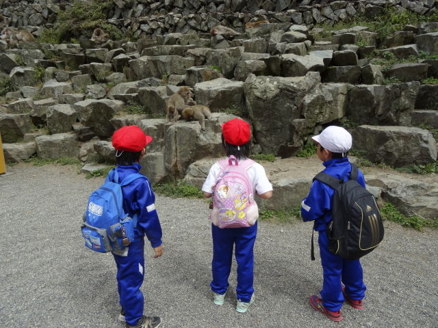 秋も盛り、小学生の遠足の時期になりました。先ず最初に訪れたのは地元も地元、もっとも近くに位置する小学校。我々スタッフの大半の母校でもある。まだ幼さの残る1年生、このくらいだと我々の注意も話もちゃんと聞いてくれる。だが、さすがは地元、遠方の学校と比べると多少なりともサルの知識がある。スノーモンキーなんて呼び名も知っていたりする。まぁね、たまに学校の周りにサルが現れるような環境だからね、当然と言えば当然。ただ、やっぱり、「サルは何を食べて暮らしてるでしょうか?」なんて聞くと、「バナナ!」なんて言う答えが返ってきますがね。