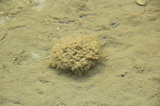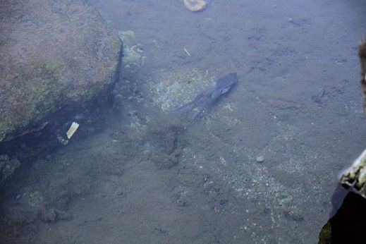 ヤマアカガエル。管理事務所の近くの池にて。池の泥を巧みに利用し、隠れています。ヒトの気配を察し、いわゆるカエル泳ぎで、ヒトから死角になる場所さっと身を隠して逃げます。