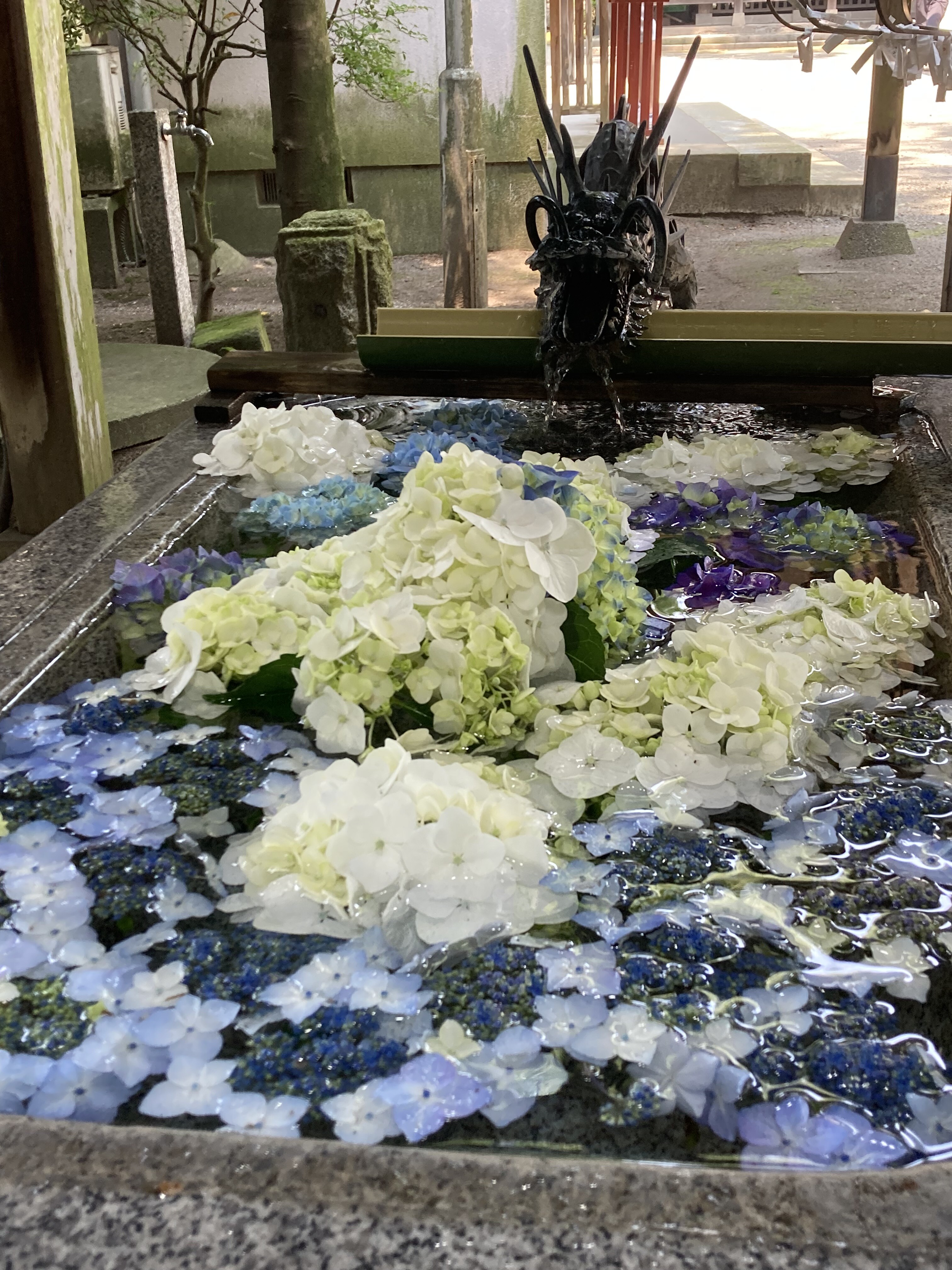 紫陽花が咲くなか 手水舎に行ってみると