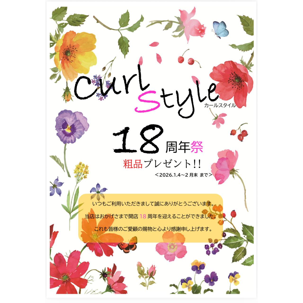 ⭐︎18周年祭⭐︎ 新年のご挨拶 2026年01月04日 07:00 新年 あけましておめでとうございます2026年も皆様にとって健やかで実りのある素晴らしい1年となりますように心よりお祈り申し上げますたくさんのお客様に支えられまして、おかげさまでCURLSTYLEは18周年を迎えることとなりました心ばかりでございますが、2月末までご来店の皆さまに粗品進呈させて頂きます皆様のご来店心よりお待ちしております長年のご愛顧賜りまして心より感謝申し上げますCURLSTYLE 「情報」カテゴリの最新記事 タグ :#福井市ネイルサロン#まつエク#福井市ネイル#CURLSTYLE#curlstyle#周年祭#お知らせ#アイラッシュサロン福井 < 前の記事次の記事 > コメント コメントフォーム 名前 コメント 評価する リセット リセット 顔 星 投稿する 情報を記憶