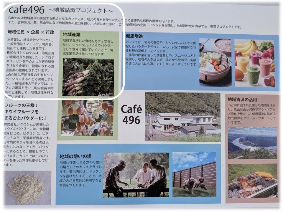 さらには、Cafe496では、地域で栽培したキウイフルーツや大根を自社開発のシクロデキストリン技術を用いて健康増進のための料理や飲料を提供し、これらの食を弓削⇒瀬戸町⇒岡山⇒日本⇒世界に広げていきたいと思っています。
