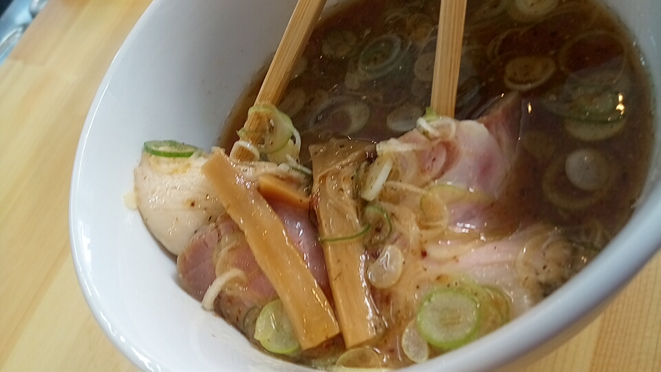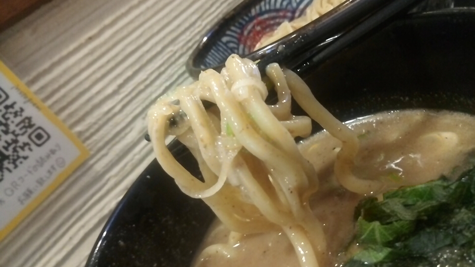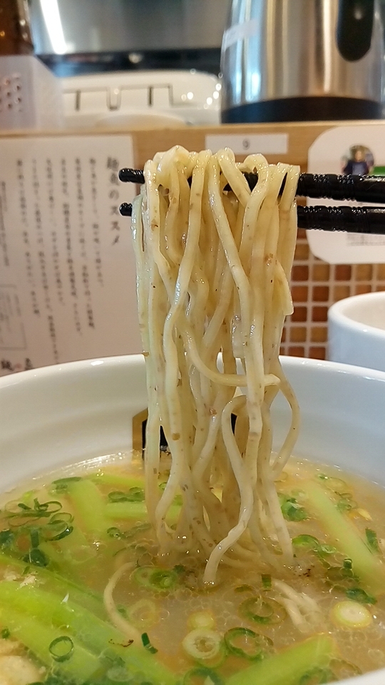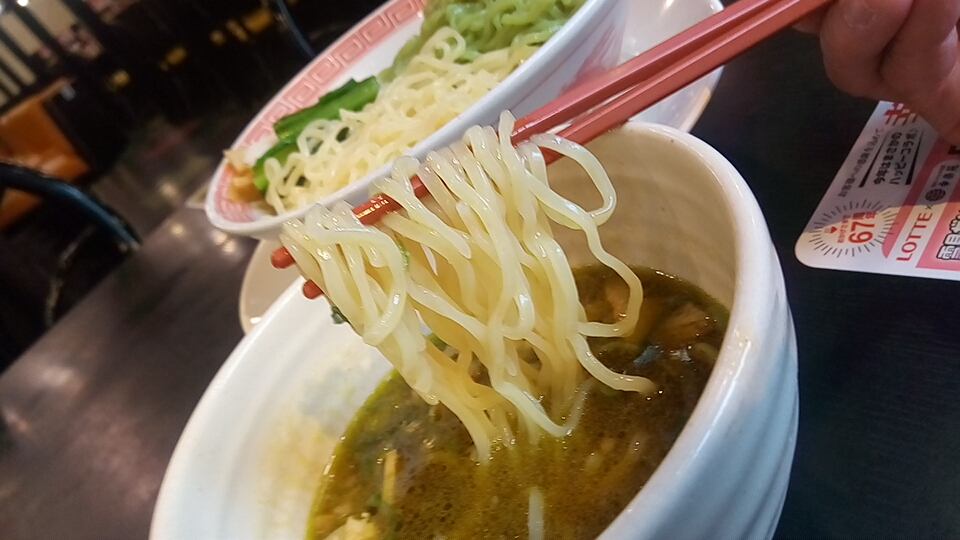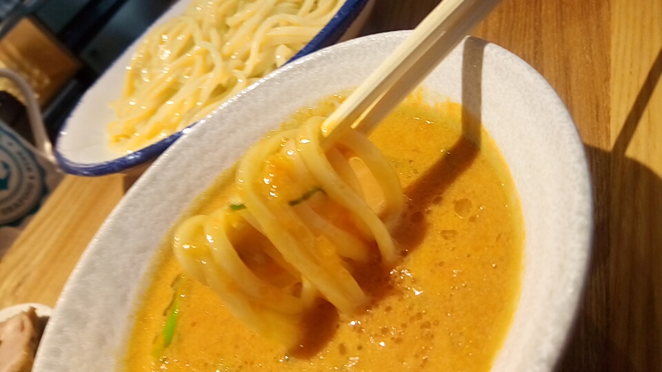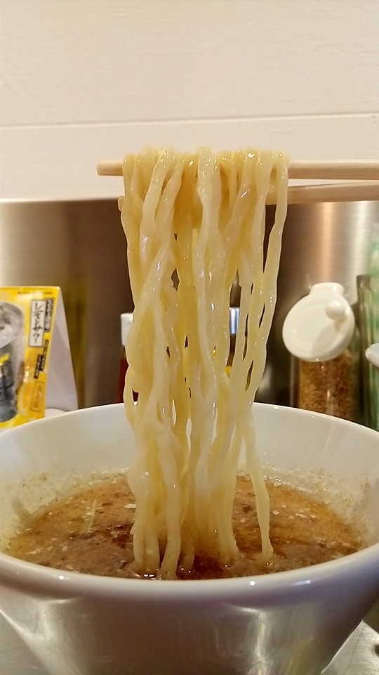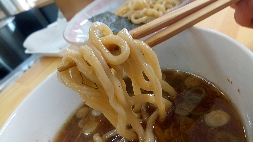 つけ汁は酸味と辛味と粘度の無い真鯛オイルのオイリー感が弱アリな塩味で、動物系の出汁が使用されていないので真鯛の風味(エグ味・生臭さ)が鼻腔をくすぐる少しオイリー感が強い柚子が仄かに香るつけ汁に仕上がっています。