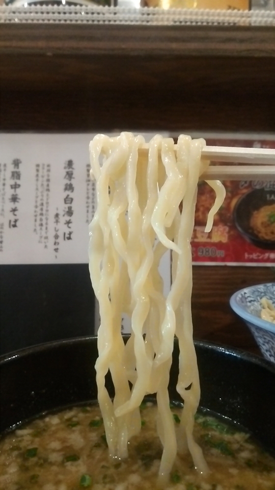 麺は角細ウェーブのエッジに丸みを帯びた国産小麦100%使用の石臼挽きで、所々に斑点が見受けられる栄養価の高い全粒粉仕様のポキポキ感のある啜り心地が気持ちいい美味しい麺です(麺量:茹で前250g位で腹中いっぱいです)。
