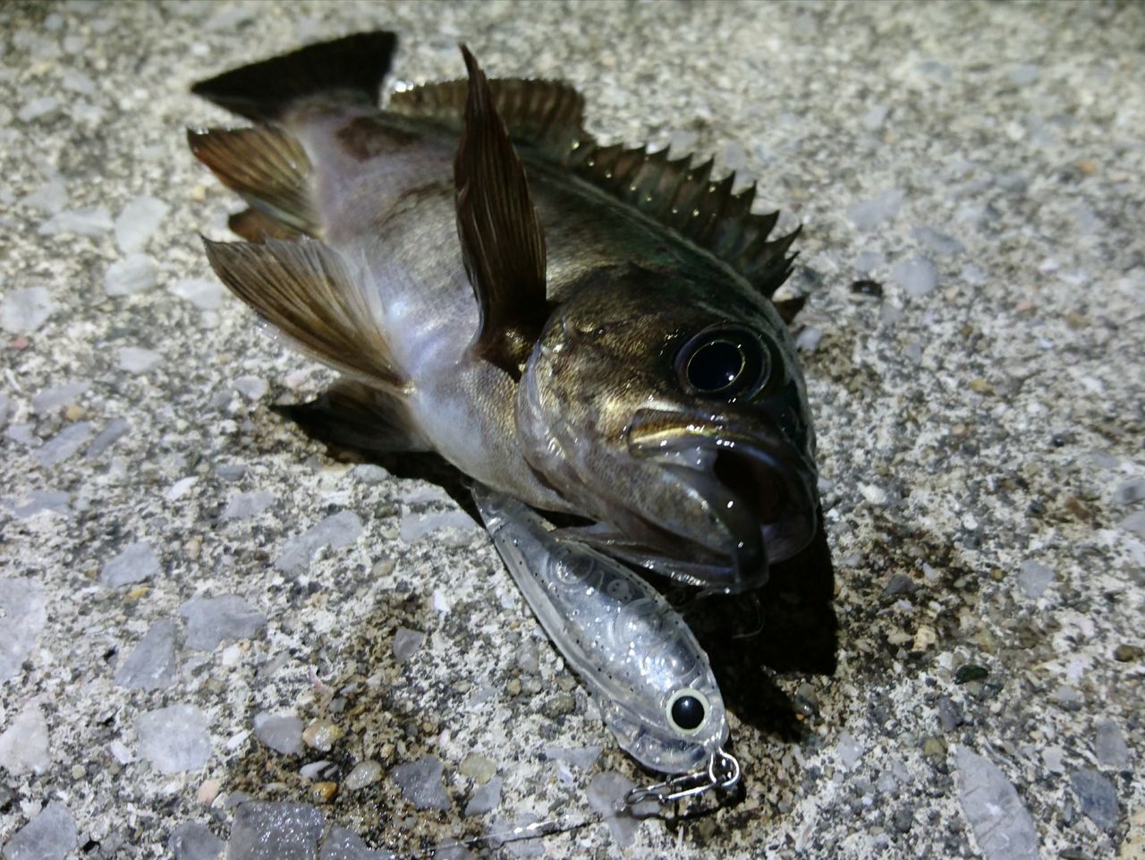 メバル狙いのタックルだったので、リーダーを60cmくらいとったFシステムで表層を探りますが、アジどころか子メバルの反応もありません。