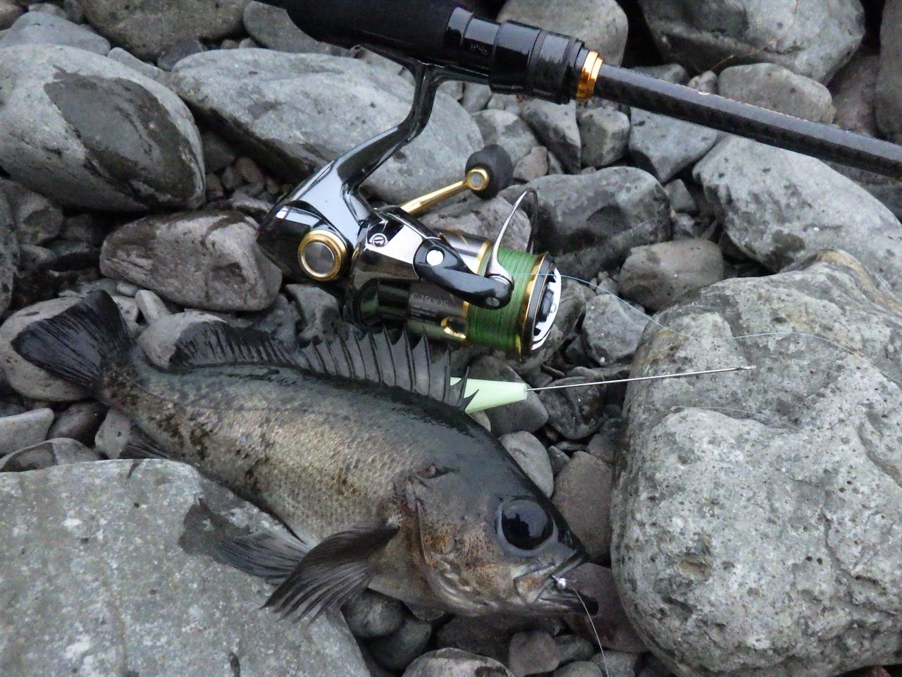 やっぱり今日は外したかなーとか考えながら、多少藻場がからんで流が緩むエリアを同じように流すこと3投目、アクションを入れてからのフォール中にコツンと生命反応。