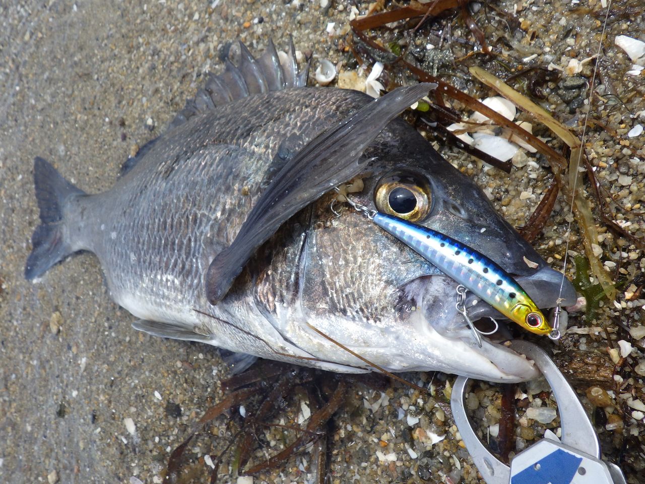 大潮ど干潮の遠浅シャローエリアで昼下がりからのスタートという悪条件のなか、トップから始まってコルセア、シャローマジックにメタルマスター、扇クローのジグヘッドリグまで投入しましたが、活性が高いのはこの子。