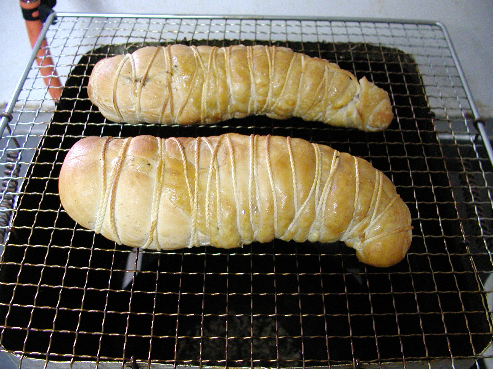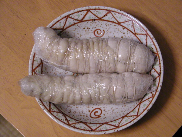 仕上げに塩をすり込んだのをタコ糸でぐるぐる巻きにしてラップをしたのを冷蔵庫で