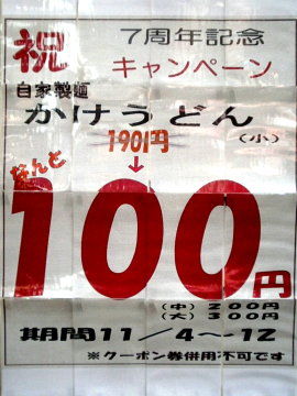 7周年ということで12日までかけうどん(小)が100円。