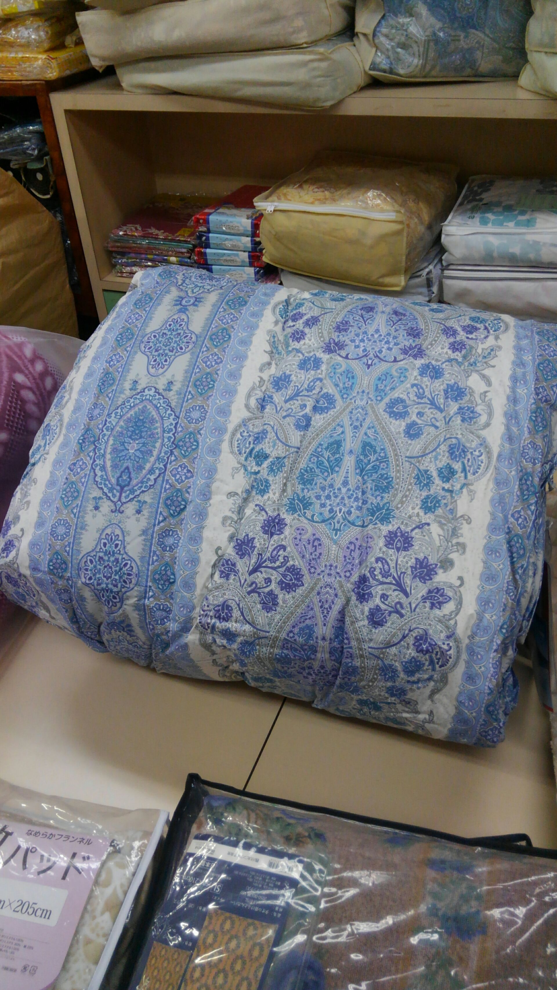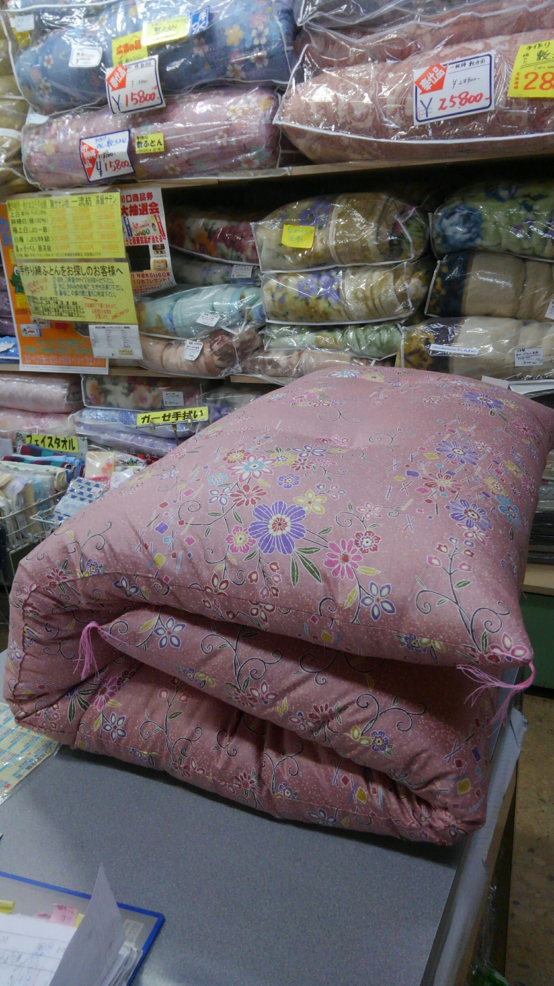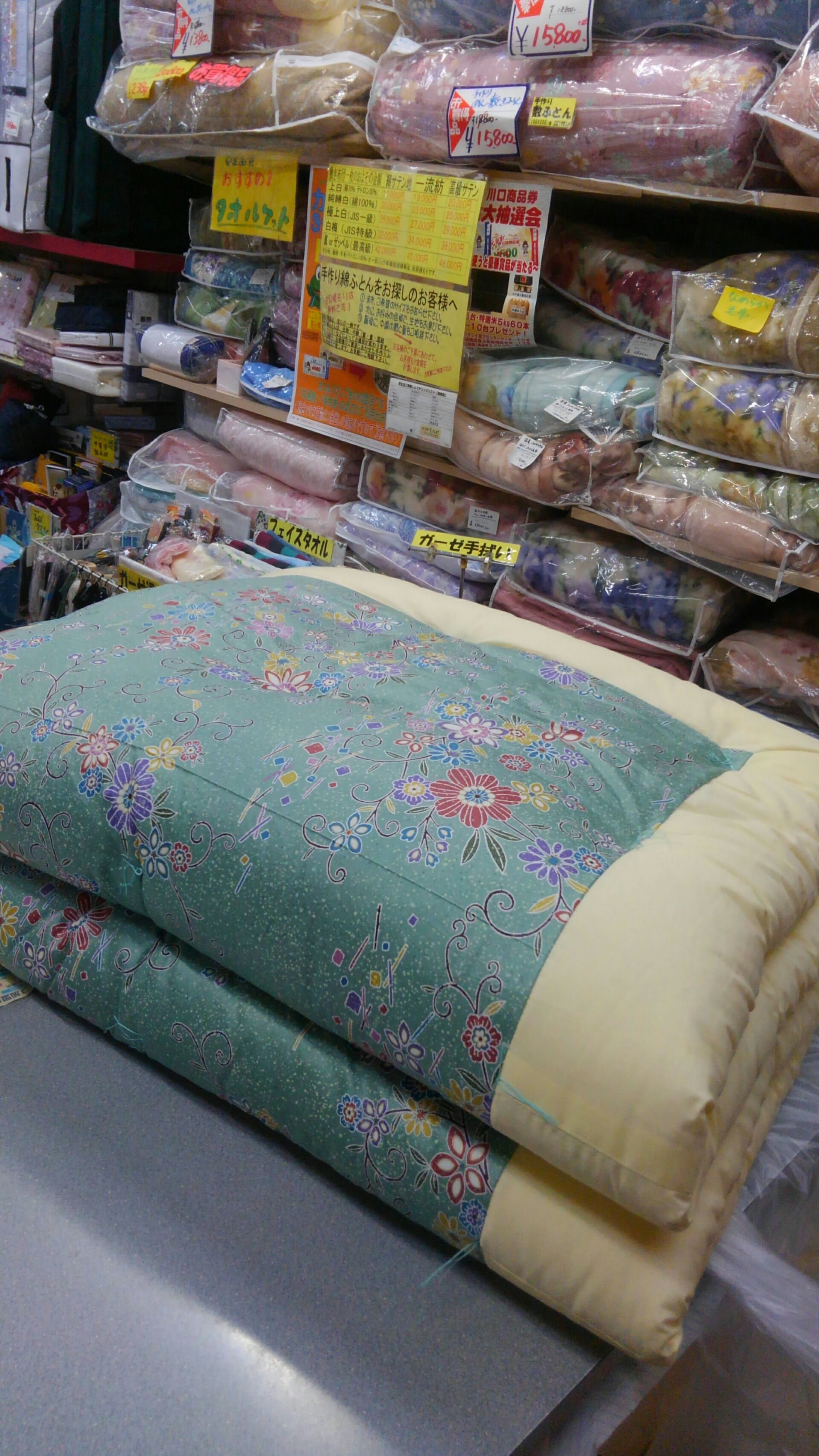 前に新しい【綿の敷きふとん】や、【マットレス】をお買い上げくださったK さまが、【冬用の綿の掛け布団】と、【掛けカバー】を買いに来てくださいました。(^人^)