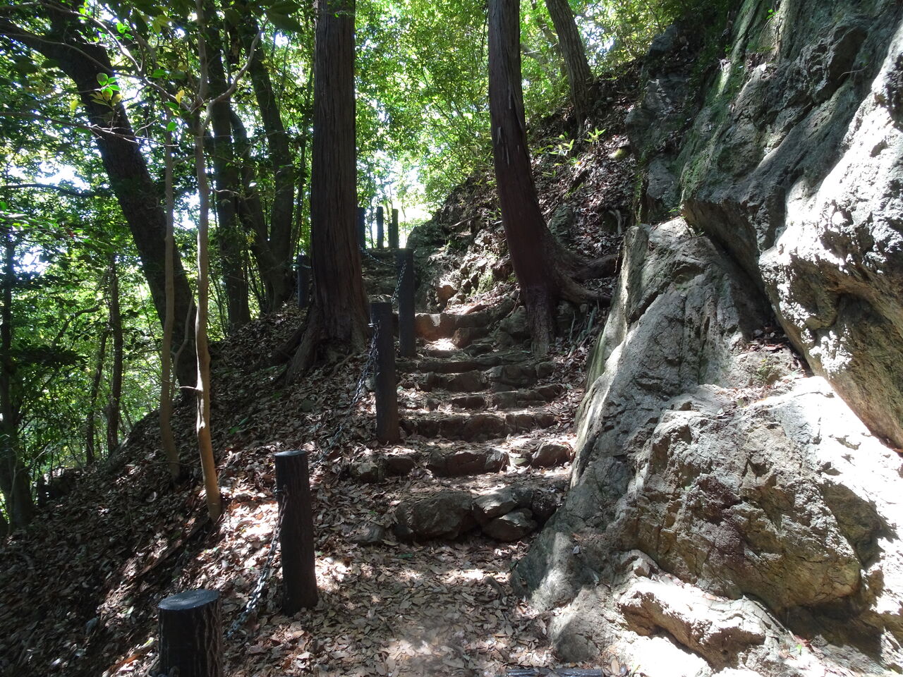 山自体は851メートルと高くはなくて、案内板などもちゃんと整備されていて、行きかう人も結構多いハイキングコースといった感じの行程でした。唯一といってもいいくらいの難所、鎖場(左画像)は現在通行禁止になっているようです(う回路が整備されているようです)。