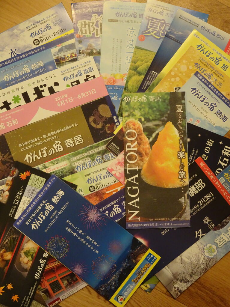 左画像:過去に宿泊した旅館、ホテルなどのパンフレットかんぽの宿は、もともとは簡易保険加入者しか利用できなかったらしいのですが、郵政民営化以降はだれでも利用できる施設になったそうです。ここから近いところだと寄居ですかね。
