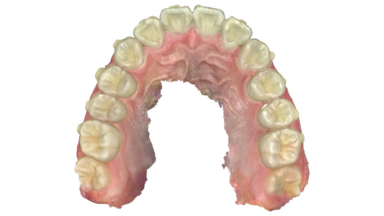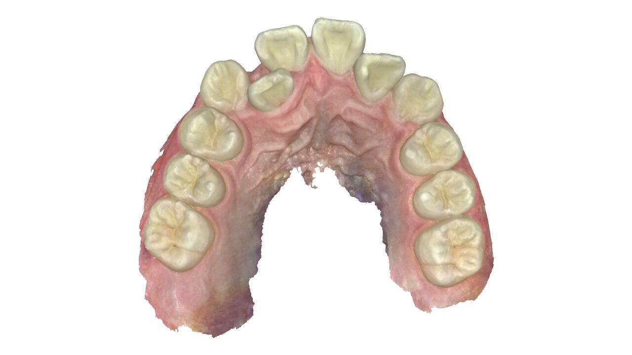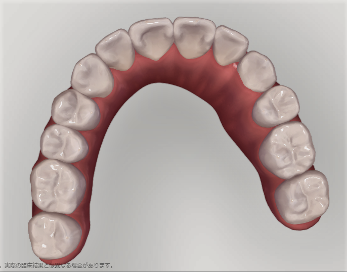 上の歯。引っ込んだ歯が歯並びの中に納まっている。