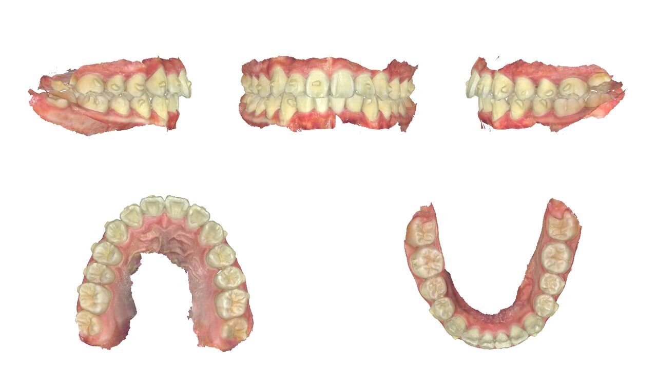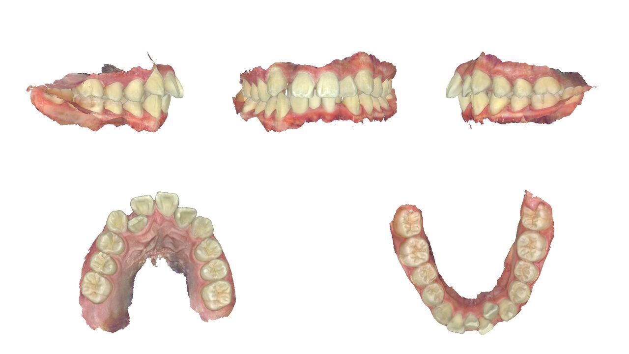 上の歯。前歯に内側に引っ込んだ歯がある。