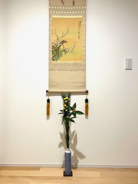 掛け軸と花。