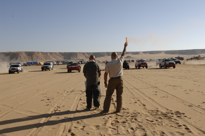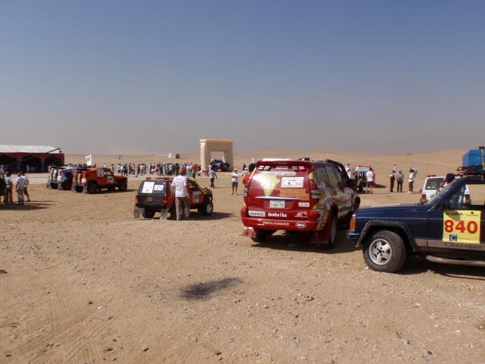 スタートは、右側から前日のリザルト順に並んでいきました。私の右隣は、ゼッケン306 のエジプトお友達チームです。スタート位置に着くと、まずは大手を振って、お互いに今日も元気にスタートが出来るという合図、そして、お互いの健闘を称え合う挨拶を行いました。スタート直前、昨日のサバイバルキットの抜き打ちチェックに続いて、HANS をきちんと装着しているかのチェックがありました。オフィシャルが寄ってきて、窓越しにシートベルトの下に手を入れて、その確認をしていきました。一瞬、ドキリとしましたが、きちんと装着をしていましたので、事なきを得ました。