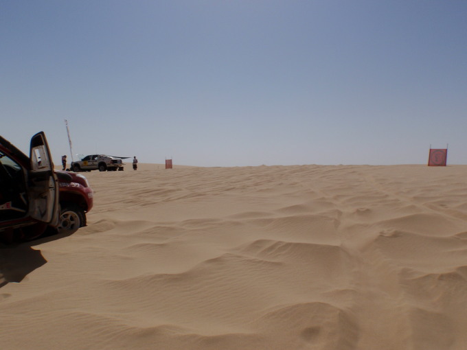 土漠から砂丘地帯へと突入、やや緊張感をもちながら進んでいた時の事です。砂丘と砂丘の間に、CP3 がありました。1つ目の砂丘を下りて、ふと前方を見ると、次の砂丘の上り途中にCPがありました。コントロールゾーン入口の黄色時計は通過したものの、砂丘の上り途中にある赤時計の真横で止まるのは無理! (埋まってしまう! ) と思ってアクセルを緩めた瞬間に、スタック… 。