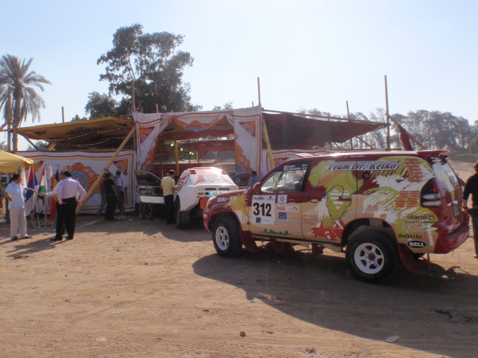 戻ると同時に、車検の準備です。ナビさんは計器類を取り付け、私は、ゼッケンやオフィシャルステッカーを所定の位置に貼りました。隣りでは、お友達のエジプトチームも車検の準備をしています。