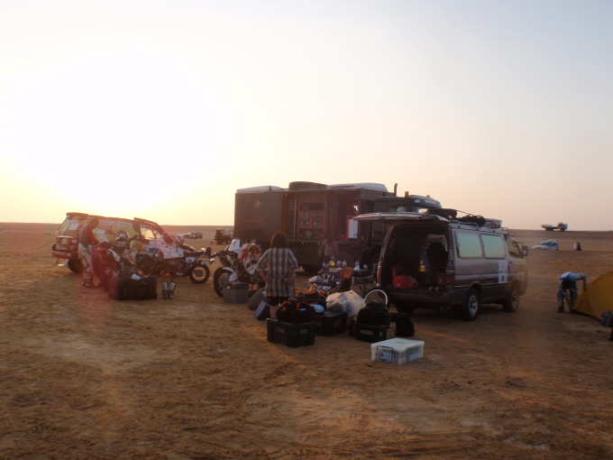ビバーク到着後、2日目のスタート時刻に間に合わせる為に、ナビさんと手分けをして作業を行いました。プラドに燃料を入れる為に、タンクローリーの前でプラドを停めて、お財布をナビさんに預けました。私は、前日のタイムカードをオフィシャルに渡し、2日目のコマ図を貰う為に、プラドの元を離れました。オフィシャルトラックを探している最中に、偶然にも、日本チームの拠点を発見しました。チーム2輪の皆さんは、既に、スタートの準備をしており、遠くから両手を振って近付くと、その中の1人が気付いてくれました。
