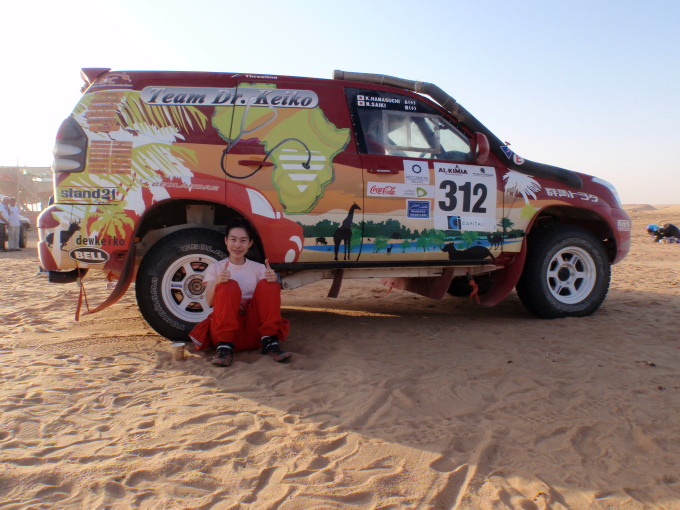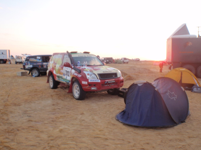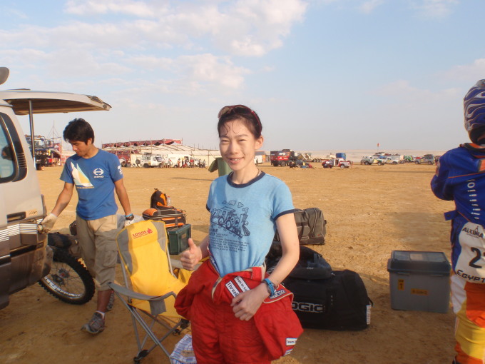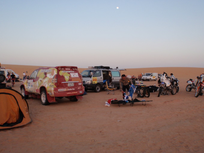 そして、日本チームのスタッフより、前夜、日本チームの間で私の門限を決めるという話が出た事を聞きました。2年連続午前様 & 朝帰りの私に対して、 “夜遅くまで砂遊びし過ぎ! ” とか “嫁入り前の娘なのに… ” と。余りの素行の悪さに、 “こうなったら、門限決めるか” という話になった様です。そんなこんなで、1時間日本チームのビバークに滞在した後に、2日目のスタート地点に向かいました。