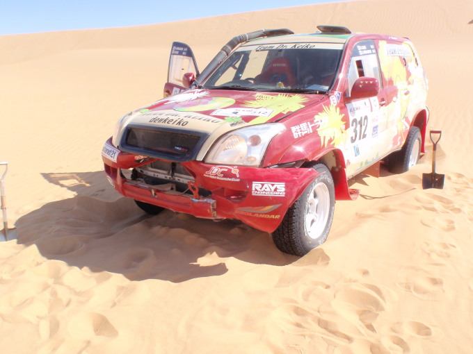最初は土漠メインのコースが続きましたが、ほどなく砂丘メインのコースへと入っていきました。重い砂の中で、今にもプラドが止まってしまいそうな程に勢いを失いながらも、何とか前日までにナビさんに教えて頂いた方法でスタックを回避しながら、順調に進んでいきました。しかし、そういった走行も騙し騙しだったのでしょうか、砂漠初心者の自分にはまだまだ学ぶべき事が多くあり、103km 地点にて、本日初めてスタックをしました。