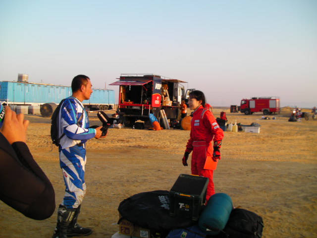 ビバーク到着後、2日目のスタート時刻に間に合わせる為に、ナビさんと手分けをして作業を行いました。プラドに燃料を入れる為に、タンクローリーの前でプラドを停めて、お財布をナビさんに預けました。私は、前日のタイムカードをオフィシャルに渡し、2日目のコマ図を貰う為に、プラドの元を離れました。オフィシャルトラックを探している最中に、偶然にも、日本チームの拠点を発見しました。チーム2輪の皆さんは、既に、スタートの準備をしており、遠くから両手を振って近付くと、その中の1人が気付いてくれました。