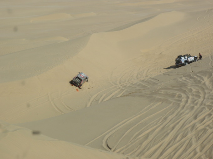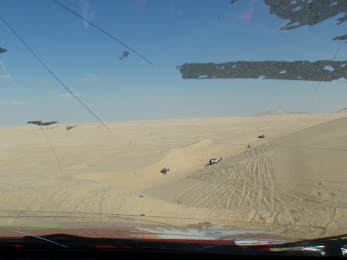 不要なスタックを未然に防ぐべく、砂丘の頂点で止まっては次のライン取りを確認し、勢いよく下りては次の砂丘の頂点で再度止まって… という走りを繰り返していました。何度かそういった走行を繰り返していると、ふと眼前の下界で、砂の中に埋もれて動かずにいる数台の車が目に飛び込んできました。その光景は、正に、蟻地獄の様でした。その様子を見て、