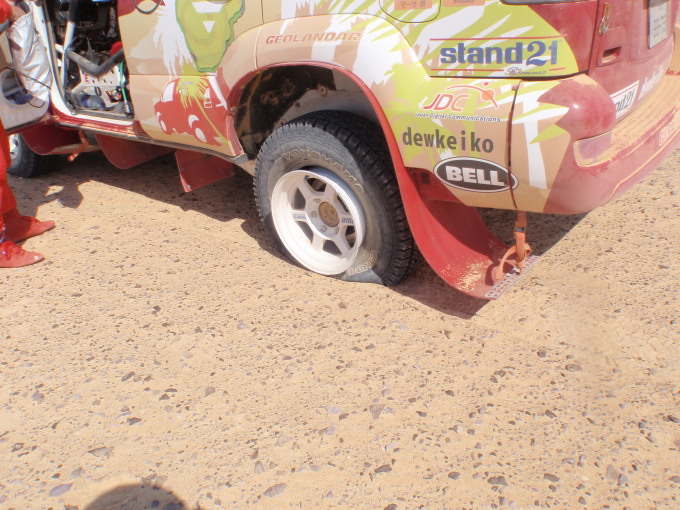 プラドを停めて見てみると… 左のリアタイヤをバーストさせていました。今ラリー初めてのタイヤ交換、2年振りのバーストです。直ぐにタイヤ交換に取り掛かりました。私は、プラドの荷室からタイヤを下ろし、交換の準備をしました。交換時間は10分程でしたが、この間に1台、プラドの横を通過していきました。