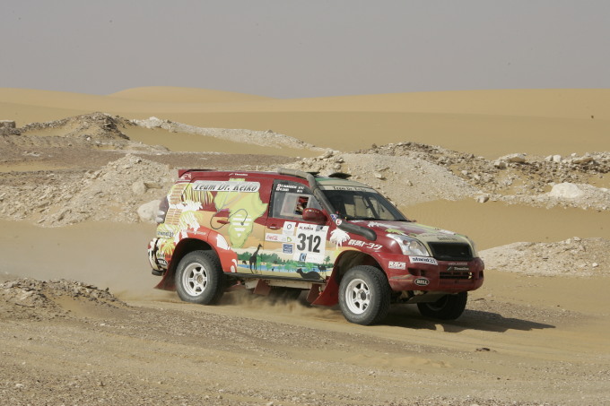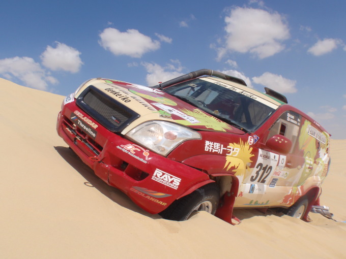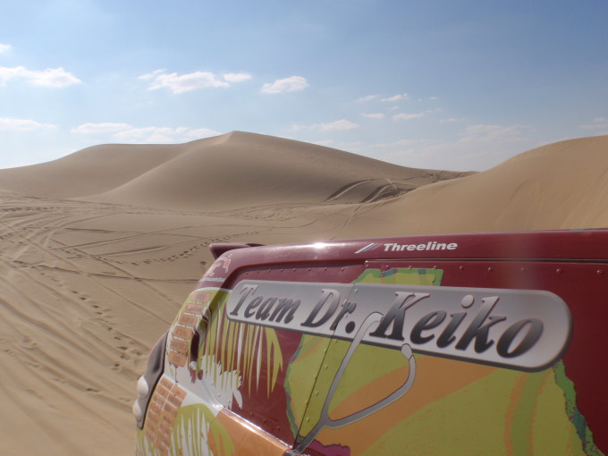 砂が重い中で、車両に充分な勢いを得る前に上っていかなければならない状況、プラドのパワーも限界で、今にもスタックしてしまいそうな状況でアクセルを踏み… 。そして、重い砂の中で、ハンドルを目一杯右に左に素早くきり… 。これをやめてしまえば、プラドはスタック、脱出までに数10分かかります。