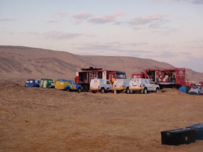 ビバークへ到着した時には、既に、19時からのブリーフィングがスタートをしていました。とりあえずオフィシャルにタイムカードを渡して、燃料を入れに行きました。プラドを日本チームの拠点に停めて、まずは休憩 & 夕食です。